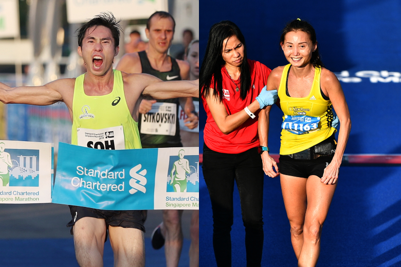 Soh Rui Yong (left) emerged as the top Singaporean male runner while physician Lim Baoying finished as the top Singaporean female runner at this year's Standard Chartered Singapore Marathon.
