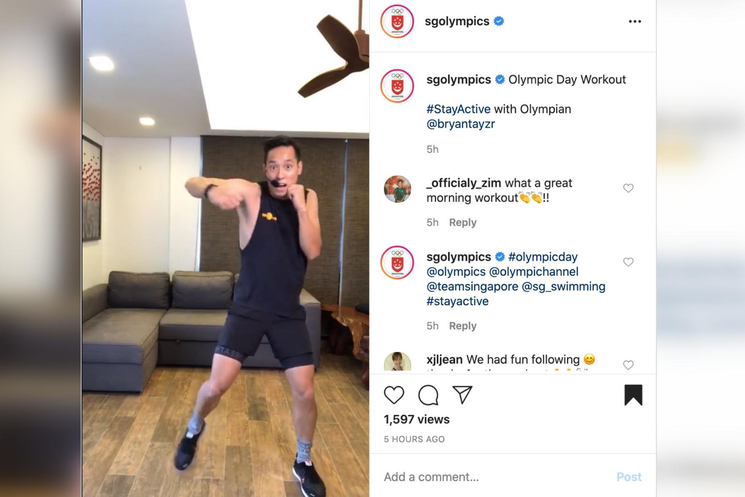 SEA Games multi-gold medallist and Olympian Bryan Tay leads a workout on Singapore National Olympic Council's Instagram account live on June 23, 2020.