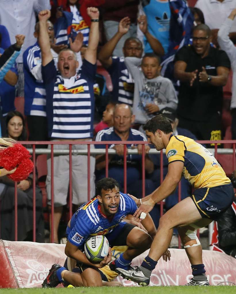 Dillyn Leyds (left) from the Stormers of South Africa reacts after scoring a try against the Brumbies of Australia.
