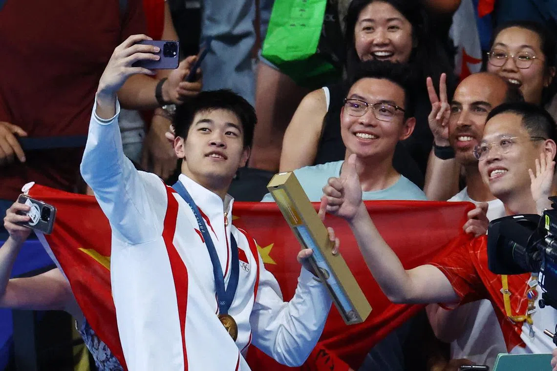 Gold medallist Pan Zhanle of China poses for a picture with spectators after setting a world record in the Men’s 100m freestyle.