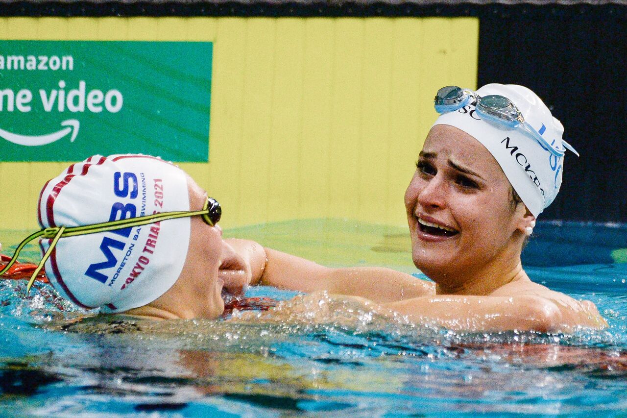 Kaylee McKeown (right) is congratulated by Minna Atherton after setting a new world record time on June 13, 2021.