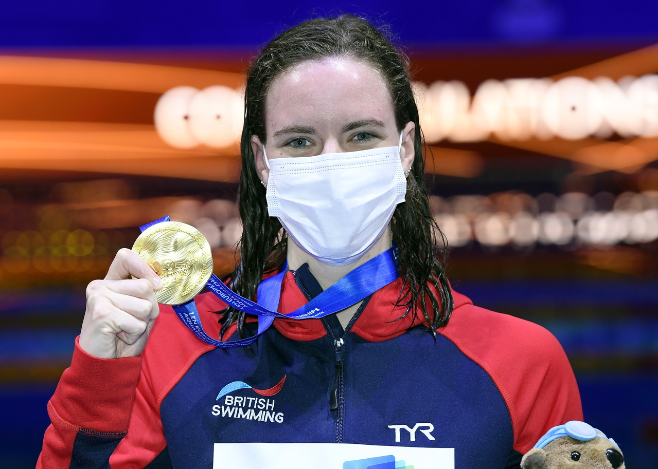 Kathleen Dawson with her gold medal during the award ceremony at Duna Arena in Budapest, on May 21, 2021.