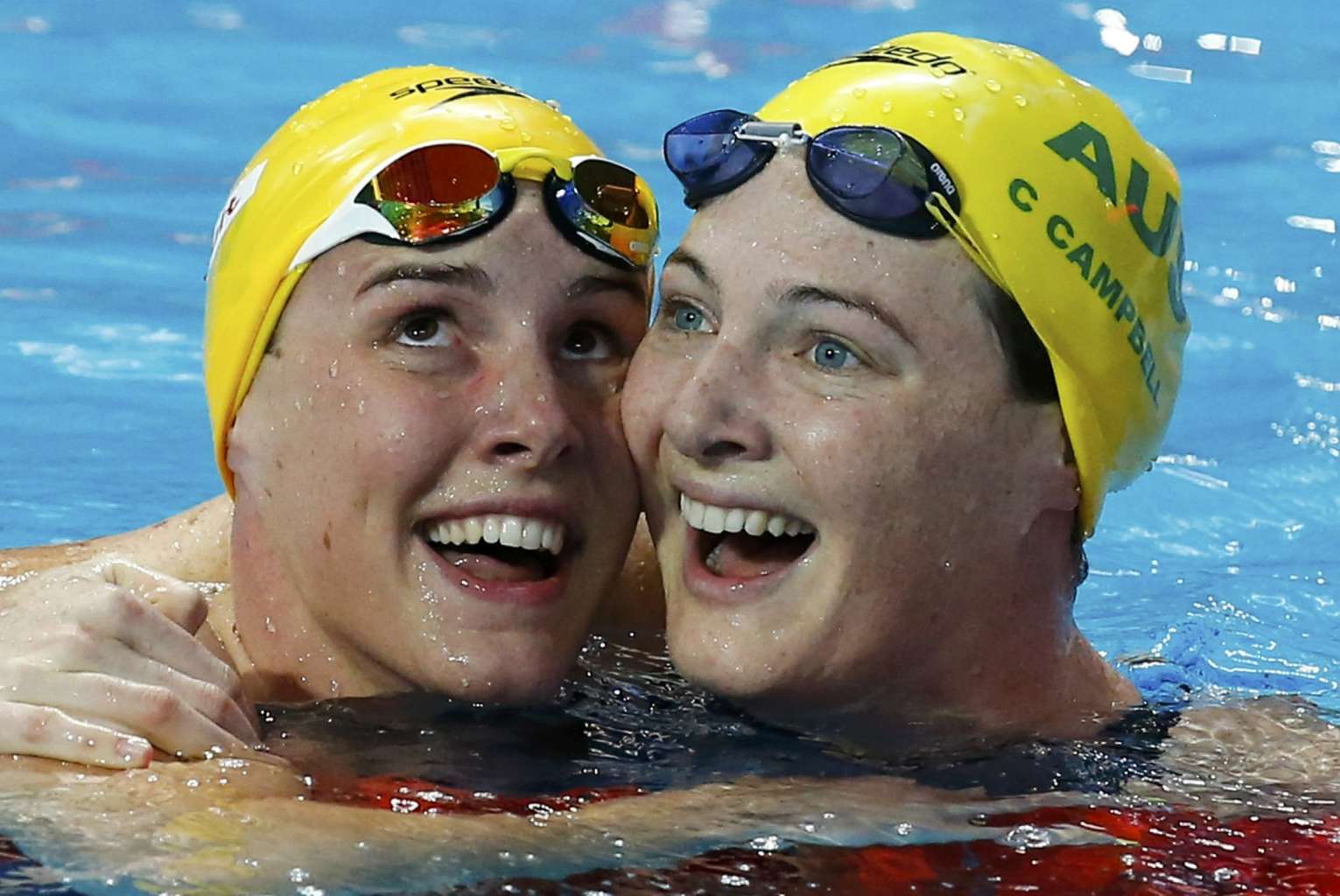 Bronte Campbell (left) celebrates with third-placed sister Cate at the women's 100m freestyle final.
