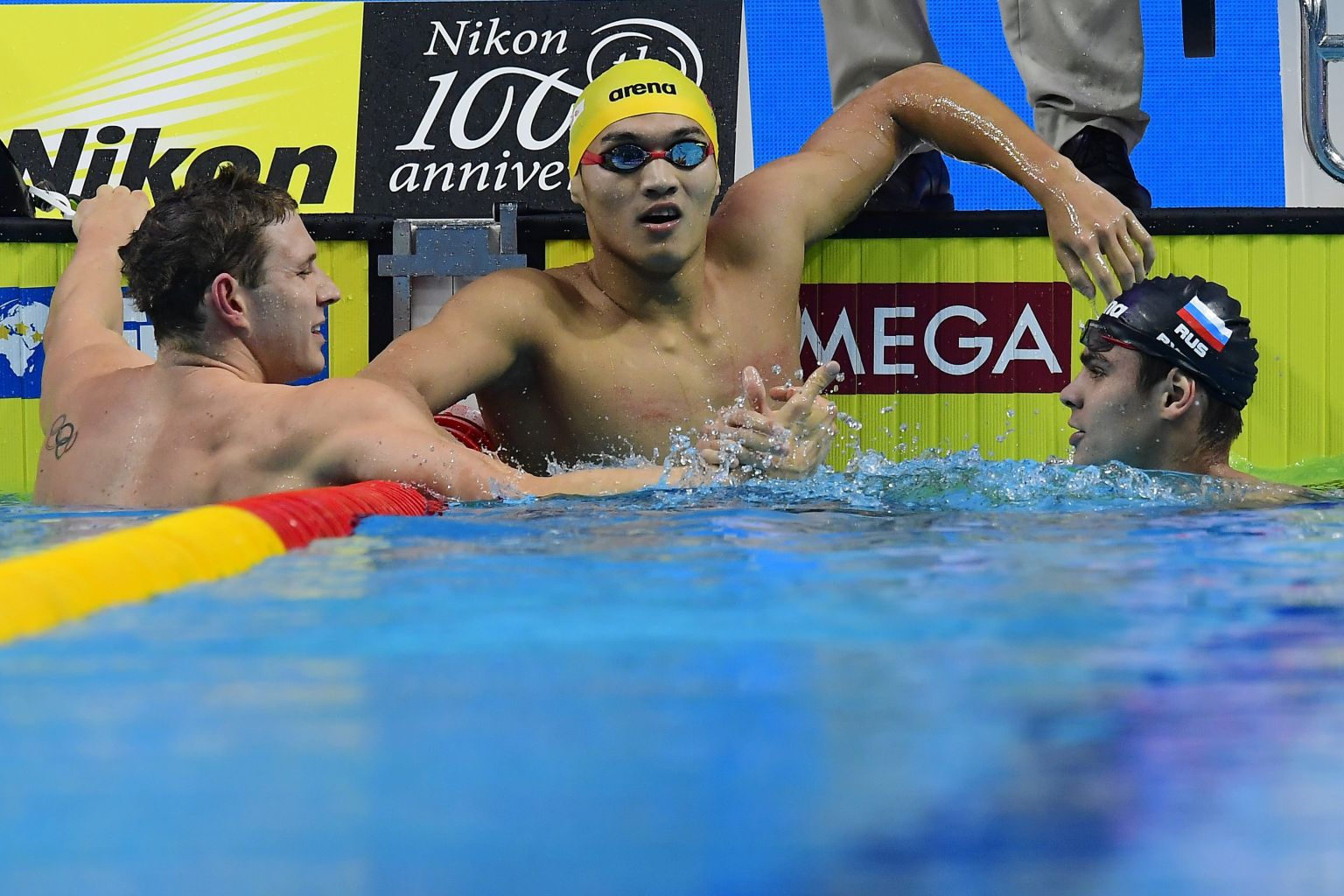 Rylov (centre) and silver medal winner Ryan Murphy shake hands after the men's 200m backstroke final.