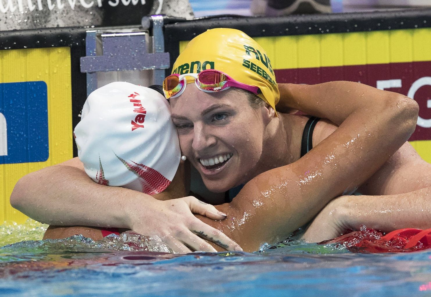 Seebohm (right) is congratulated by Kylie Jacqueline Masse of Canada after winning.