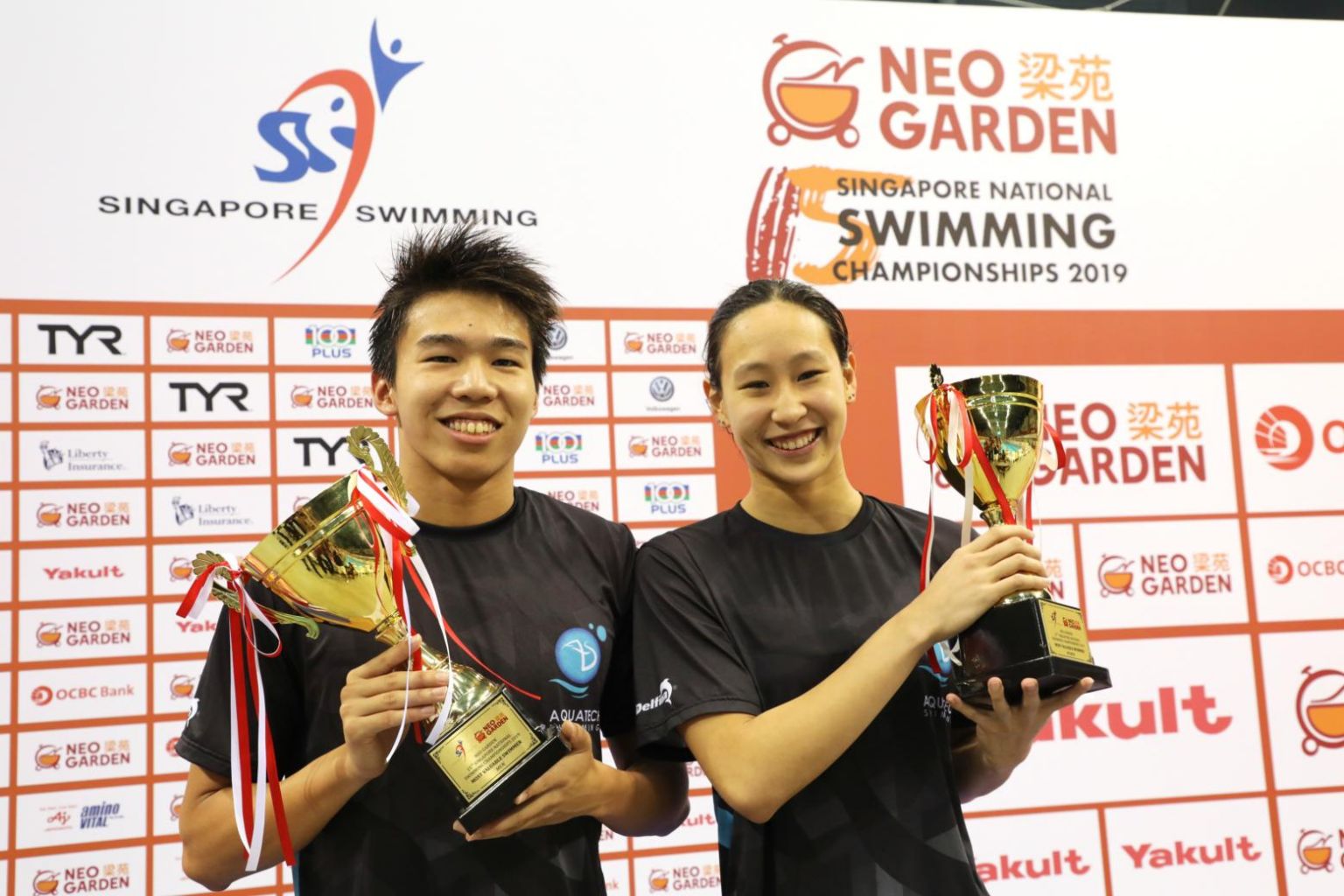 In a photo from June 22, 2019, Jonathan Tan and Cherlyn Yeoh raise their trophies at the Neo Garden 15th Singapore National Swimming Championships at the OCBC Aquatic Centre in Singapore.