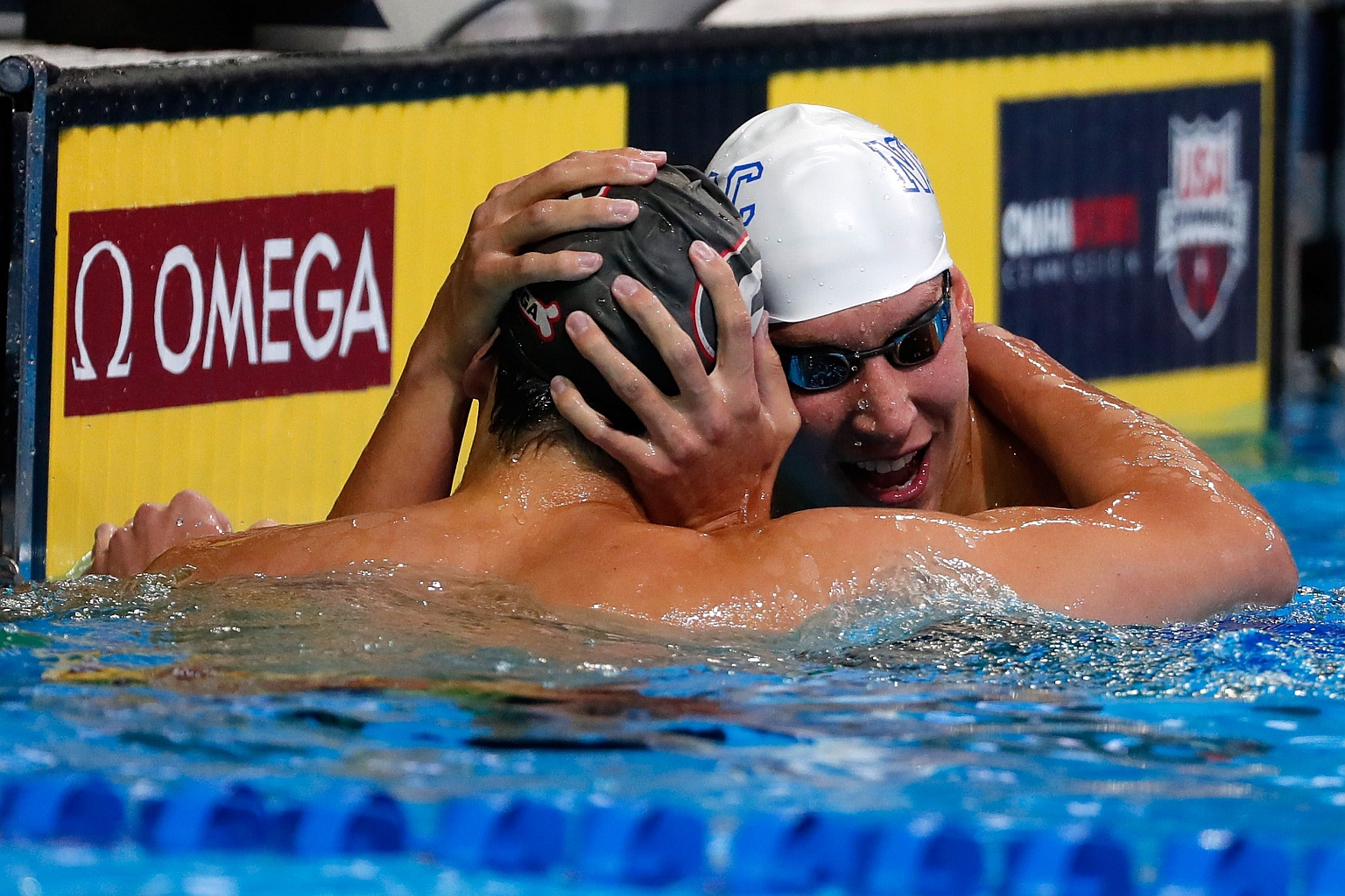 Chase Kalisz (right) celebrates with Jay Litherland after winning the final heat for the Men's 400 Meter Individual Medley during the 2016 US Olympic Team Swimming Trials.