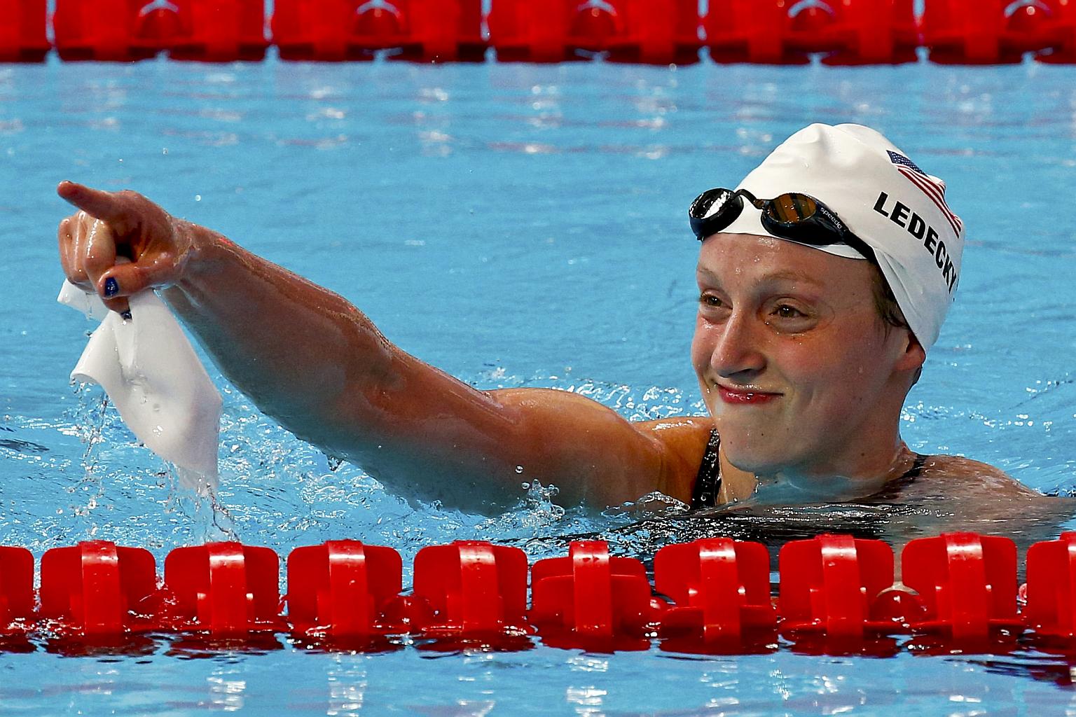 Katie Ledecky from the US celebrates after setting a new World Record in the women's 1500m freestyle heats at the Aquatics World Championships in Kazan, Russia on Aug 3, 2015.