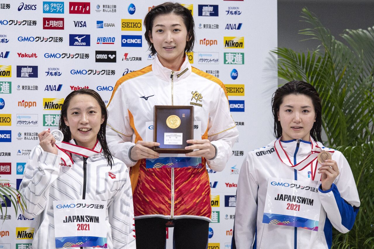 Women's 50m butterfly gold medalist Rikako Ikee, silver medalist Ai Soma and bronze medalist Yukina Hirayama.