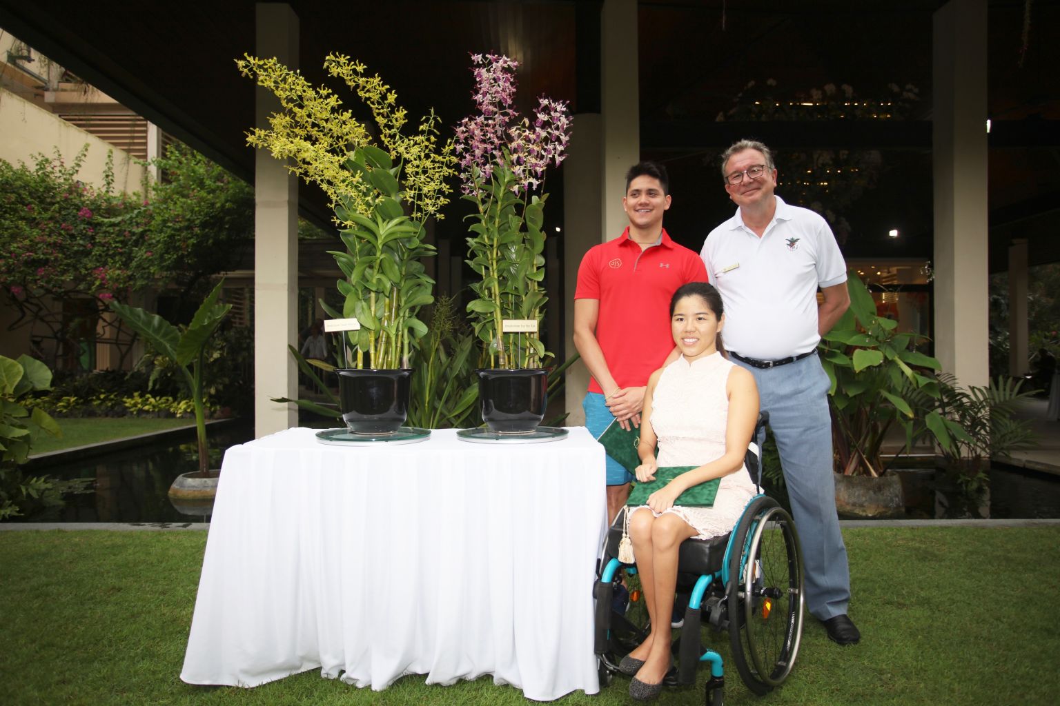 SINGAPORE - Swimmers Joseph Schooling and Yip Pin Xiu became the first local athletes to have orchids named after them on Monday (Aug 7) at a ceremony in the Singapore Botanic Gardens' Botany Centre.