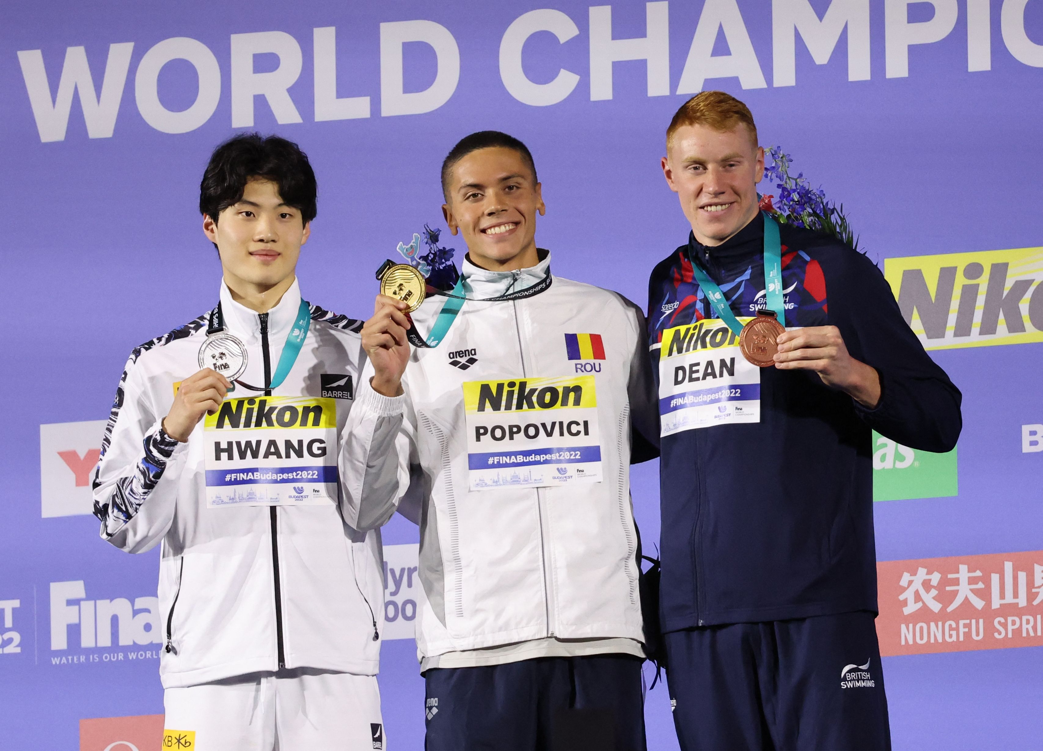 Romania's David Popovici (centre) celebrates on the podium with South Korea's Hwang Sun-Woo (left) and Britain's Tom Dean (right).