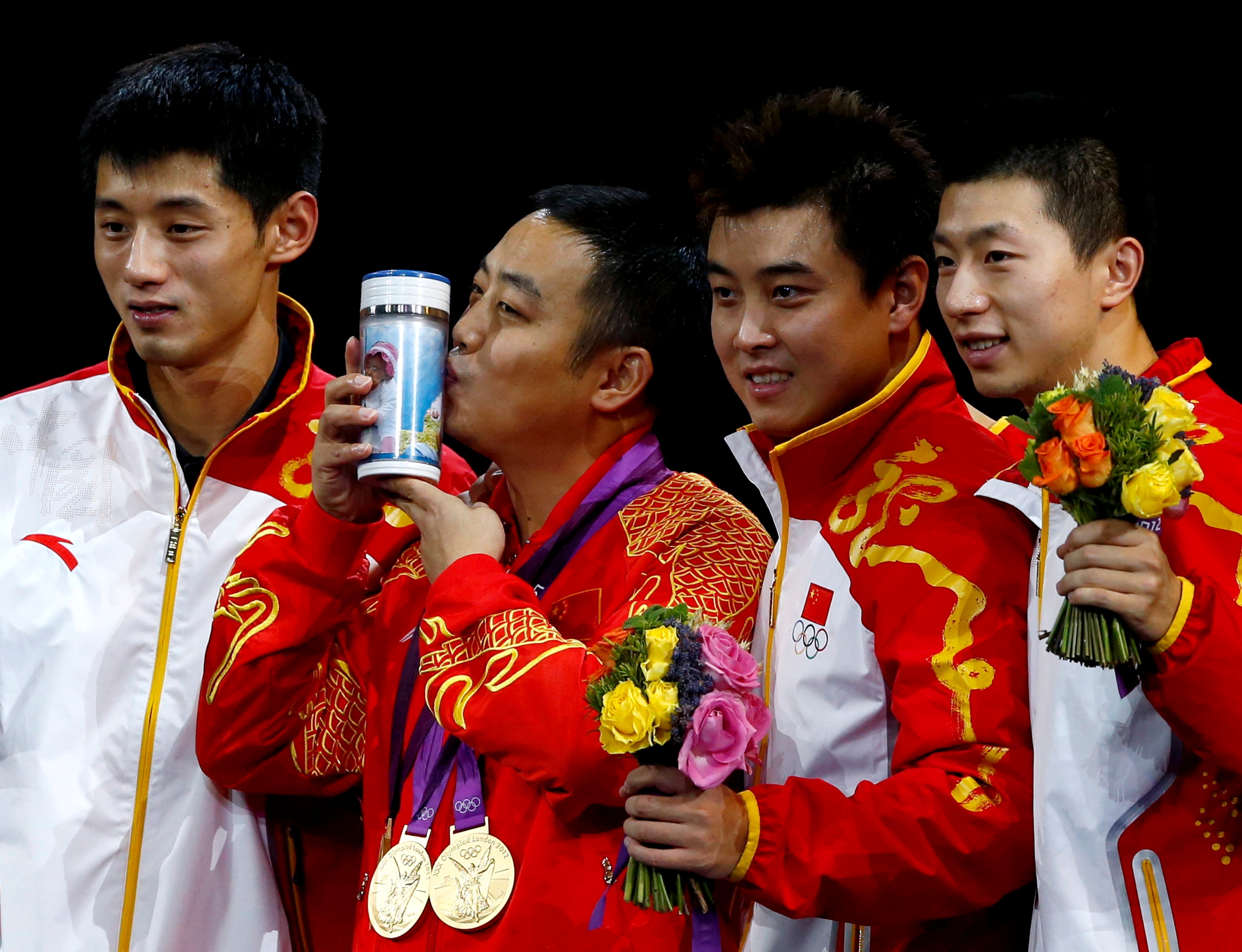 China's coach Liu Guoliang celebrates winning gold with team members (from left) Zhang Jike, Wang Hao and Ma Long.