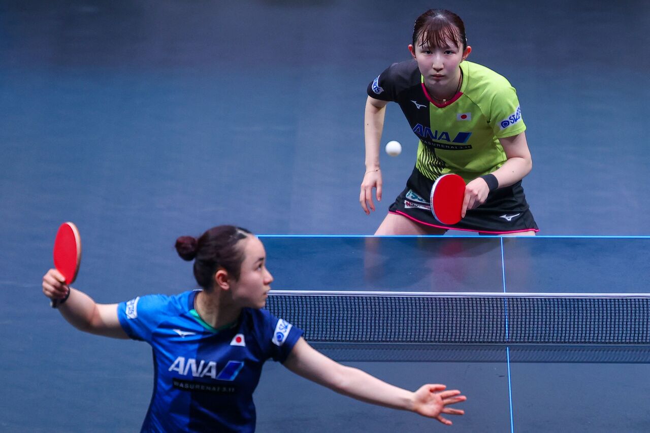 Japan's Hina Hayata (right) competes with Japan's Mima Ito during the finals of the women's singles of the World Table Tennis (WTT) Middle East Hub in the Qatari capital Doha, on March 6, 2021.