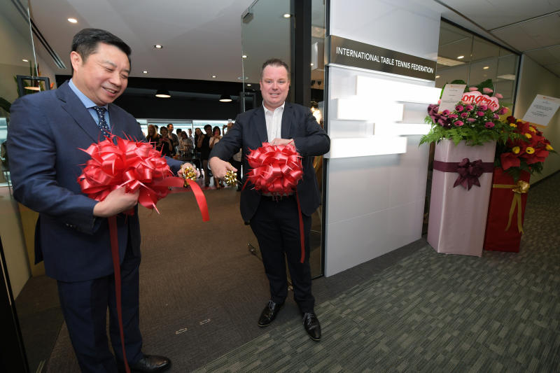 International Table Tennis Federation (ITTF) CEO Steve Dainton (right) with businessman Frank Ji at the opening of the ITTF Asia-Pacific office on Jan 3, 2019.