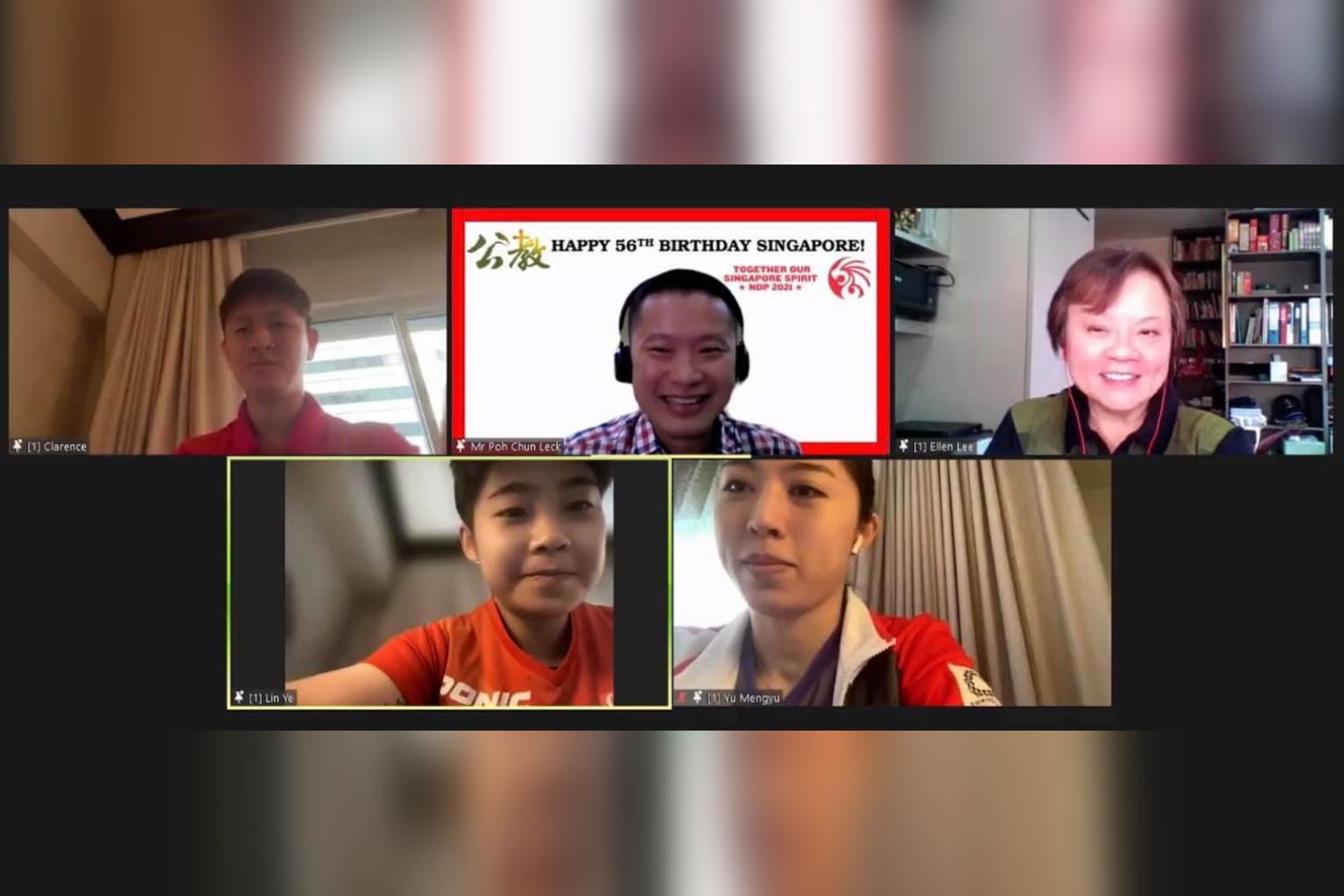 SINGAPORE - Fresh from their stint at the Tokyo Olympics, table tennis players Clarence Chew, Lin Ye and Yu Mengyu joined Catholic High School students in their National Day celebrations virtually on Friday morning (Aug 6) while serving their stay-home notice.