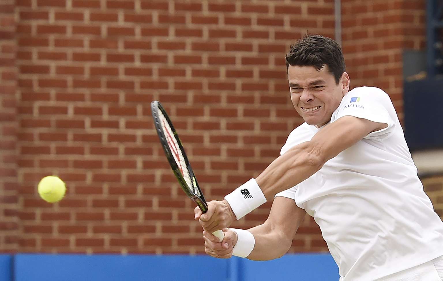 Canada's Milos Raonic returns the ball against Britain's Andy Murray during the final match at the Aegon Tennis Championships at the Queen's Club in London, Britain, on June 19, 2016.