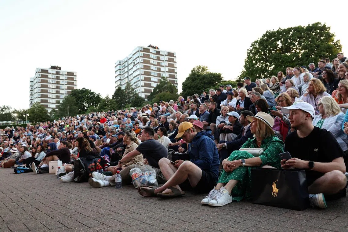 Fans watching the men’s singles tennis match between Andy Murray and Stefanos Tsitsipas on Henman Hill in London on July 7.