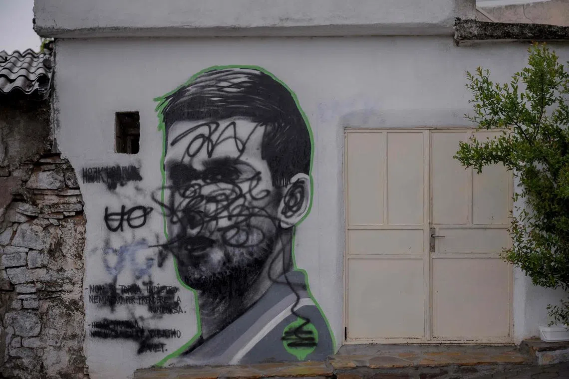 A mural of Serbia’s Novak Djokovic damaged overnight in the neighborhood in the town of Rahovec, Serbia, on May 31, 2023.