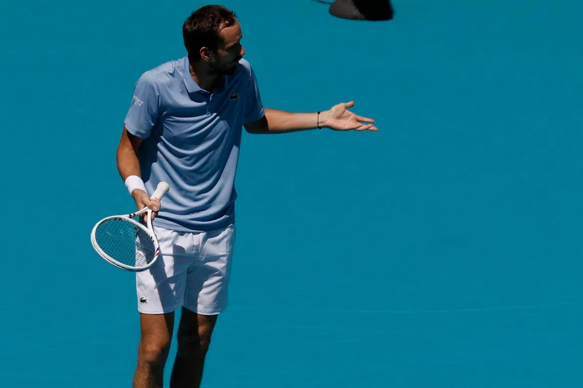 Daniil Medvedev gestures after losing a point against Francisco Cerundolo in the match at Hard Rock Stadium.