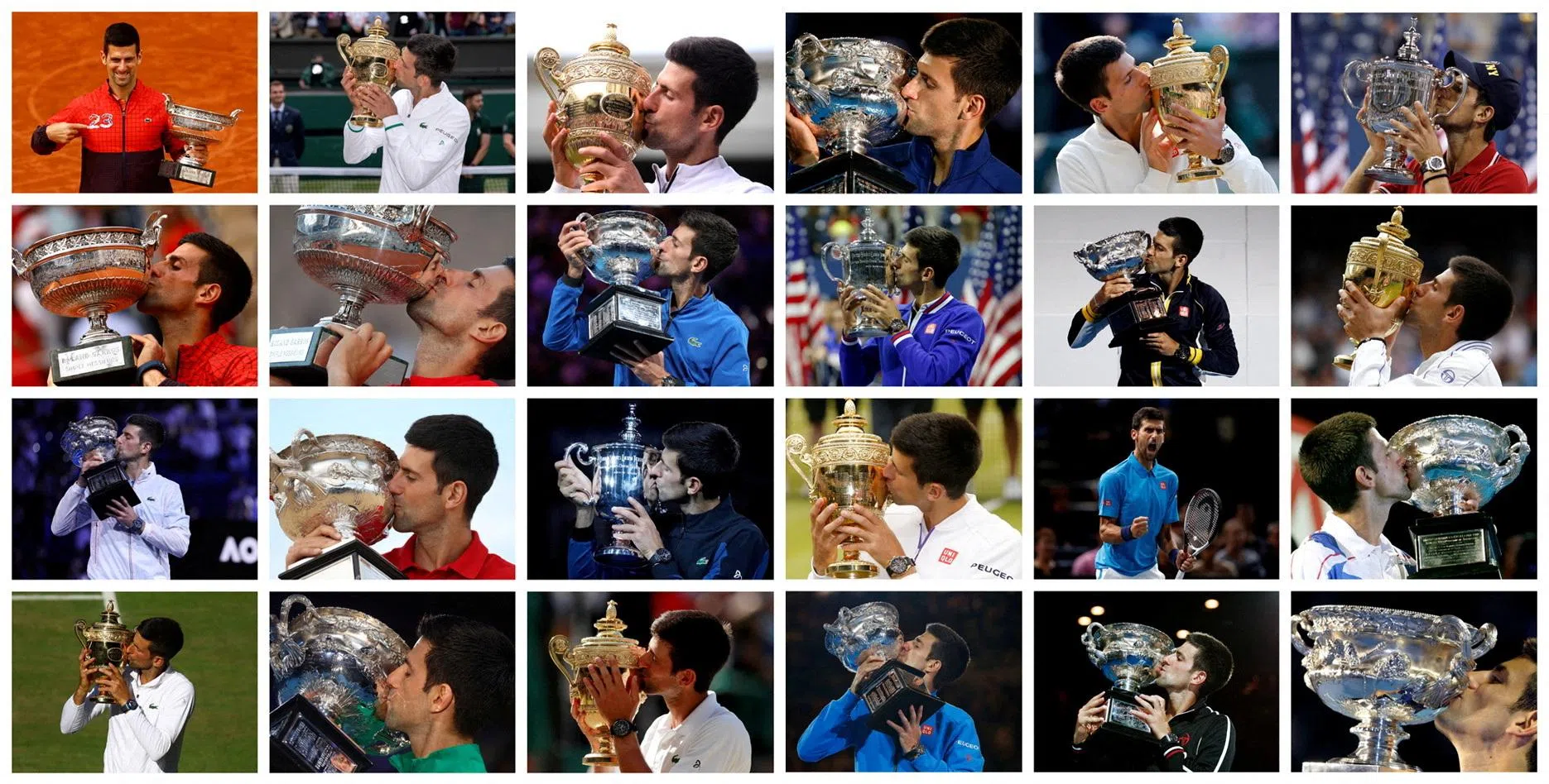 Serbia's Novak Djokovic holding each of his twenty-three Grand Slam championship trophies in this combination of photos.