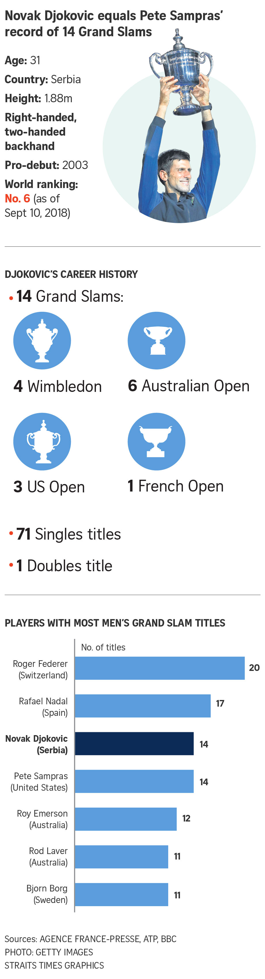 NEW YORK (AFP) - Novak Djokovic clinched his third US Open title on Sunday (Sept 9) with a 6-3, 7-6 (7/4), 6-3 triumph over Juan Martin del Potro, taking him level with Pete Sampras's mark of 14 Grand Slams.
