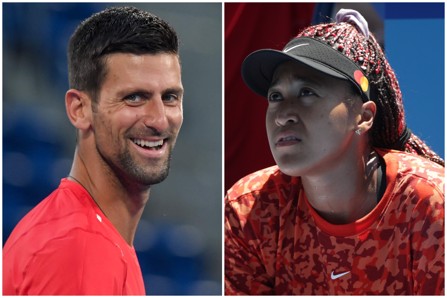 Novak Djokovic (left) and Naomi Osaka training at Ariake Tennis Park in Tokyo.