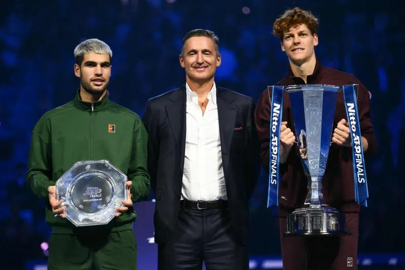 (From left) Spain’s Carlos Alcaraz, ATP president Andrea Gaudenzi and Italy’s Jannik Sinner pose during the trophy ceremony.