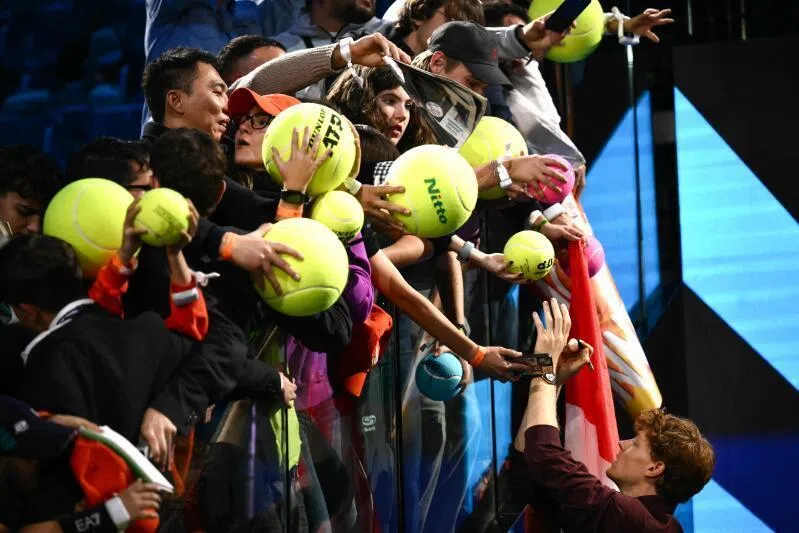Italy’s Jannik Sinner signs autographs for fans at the end of the singles decider at the ATP Finals.
