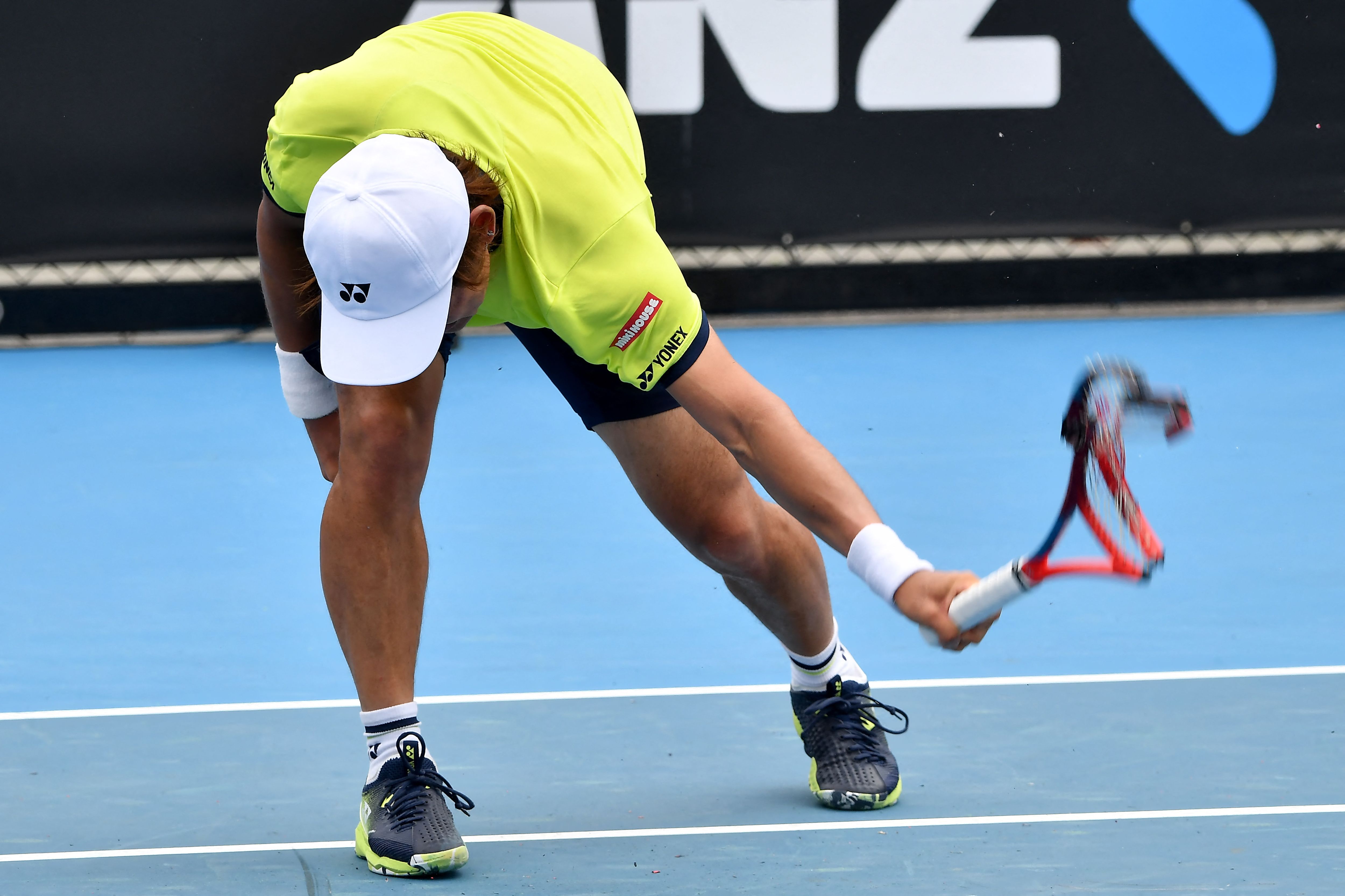 Yoshihito Nishioka smashing his racket at the Australian Open on Jan 17, 2022.