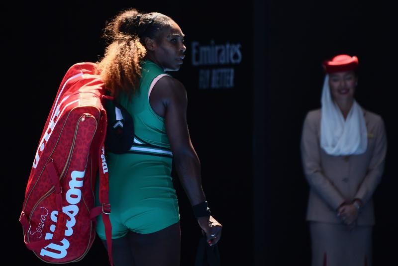 Serena Williams leaves the court after her defeat against Czech Republic's Karolina Pliskova during their women's singles quarter-final match at the Australian Open tennis tournament in Melbourne on Jan 23, 2019.