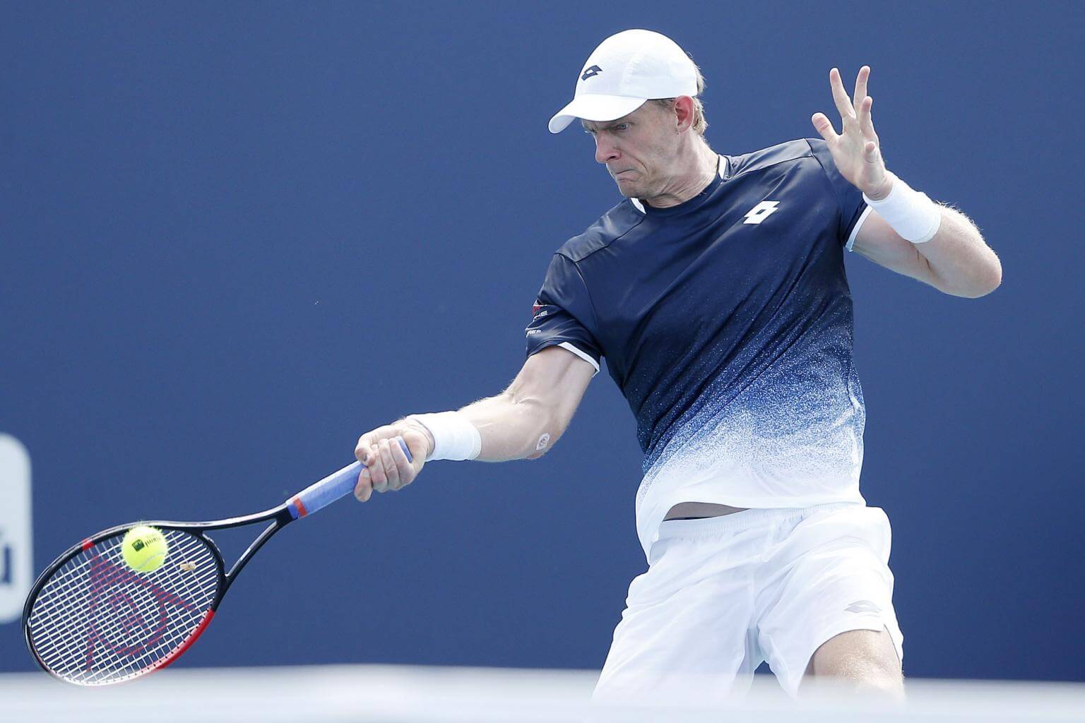 Kevin Anderson returns a shot to Jaume Munar at Hard Rock Stadium on March 23, 2019 in Miami Gardens, Florida.