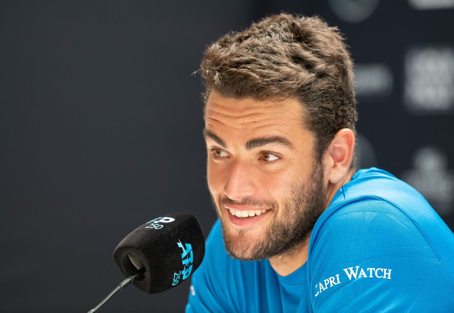 Italy's Matteo Berrettini reacts during a press conference after defeating Germany's Jan-Lennard Struff.