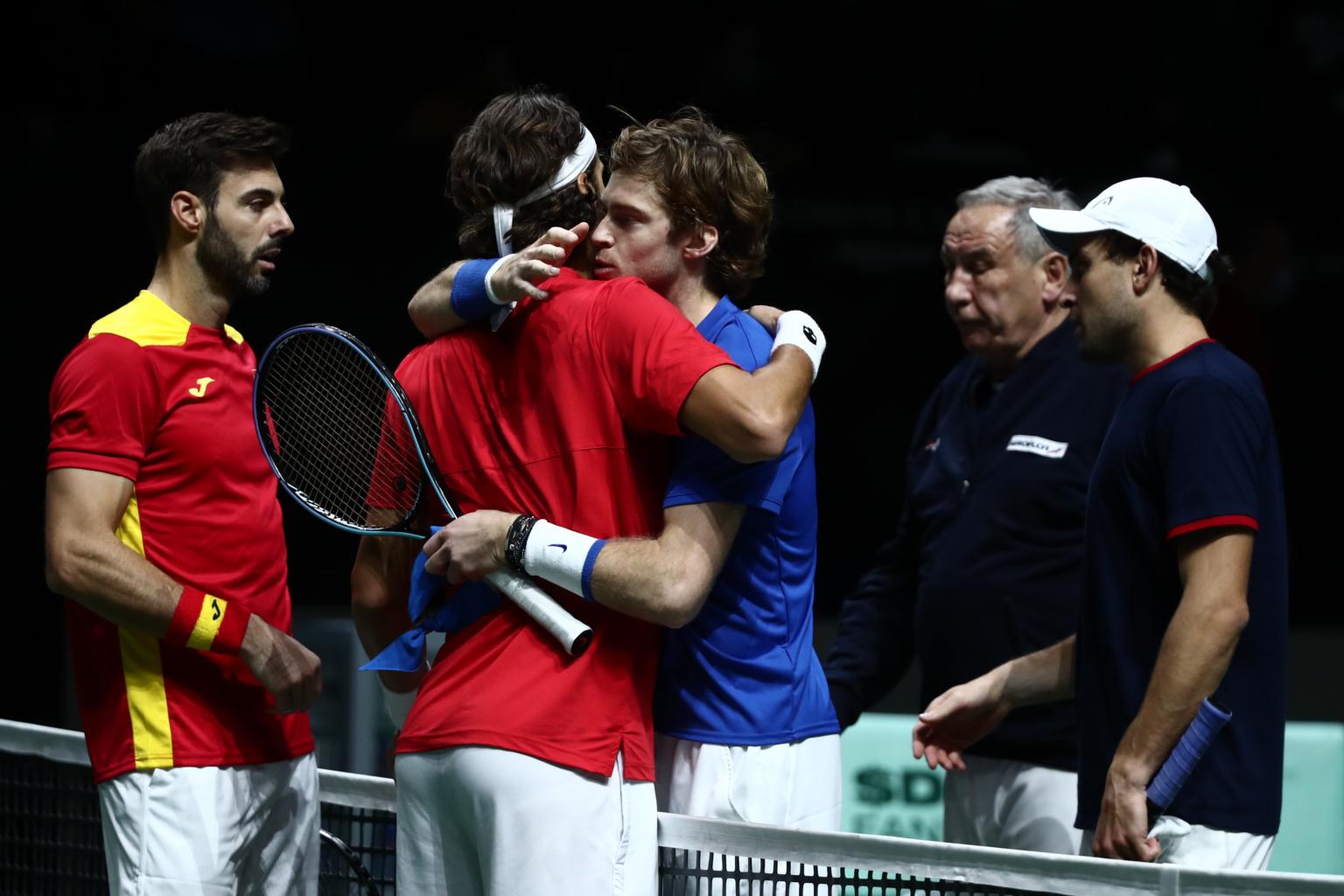 (From left) Spain's Marcel Granollers and Feliciano Lopez congratulating Russia's Andrey Rublev and Aslan Karatsev (in cap) after their Davis Cup match on Nov 28, 2021.