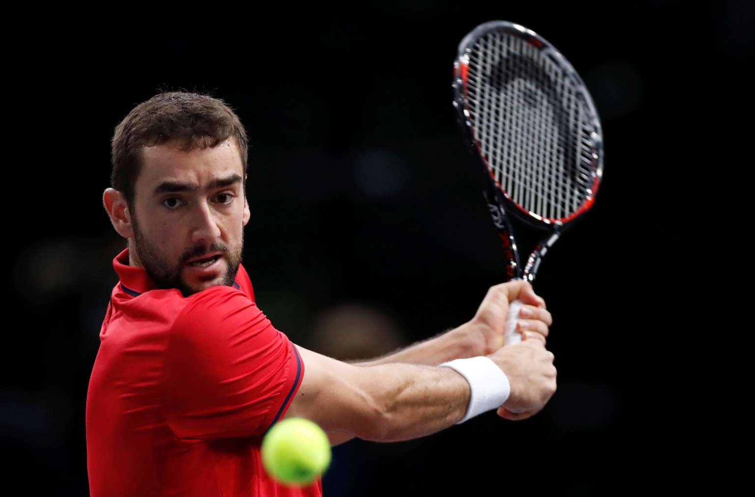 Croatia's Marin Cilic returns a shot to Belgium's David Goffin during their Paris Masters match on Nov 3, 2016.
