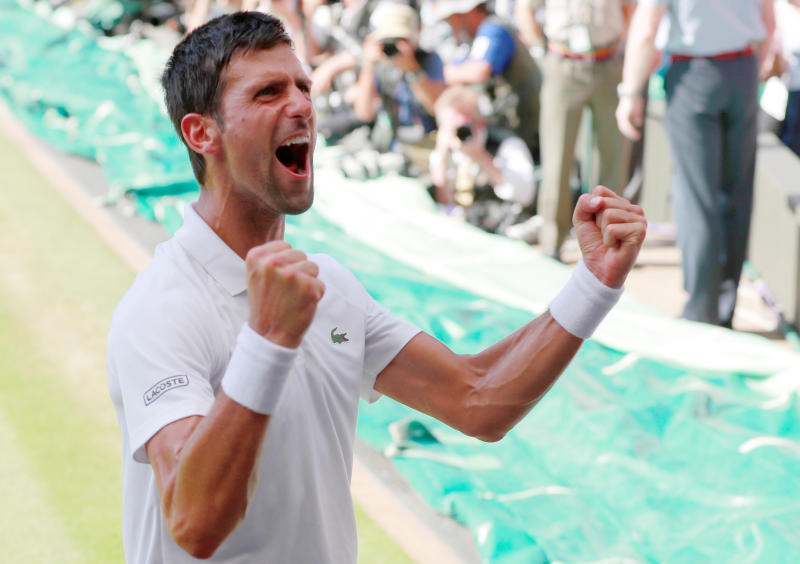 Serbia's Novak Djokovic celebrates winning the men's singles final against South Africa's Kevin Anderson (not pictured) in the All England Lawn Tennis and Croquet Club, London, Britain, on July 15, 2018.