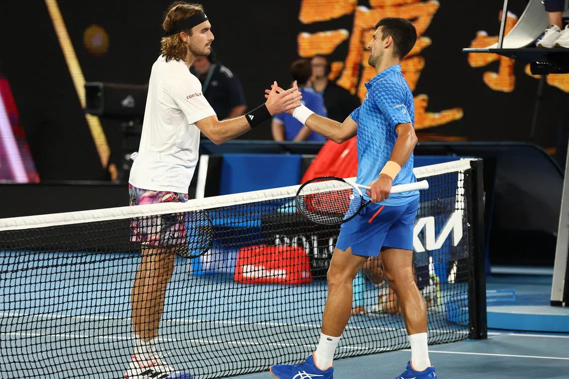Novak Djokovic (right) shaking hands with Stefanos Tsitsipas after winning the final match at the Australian Open on Jan 29, 2023.