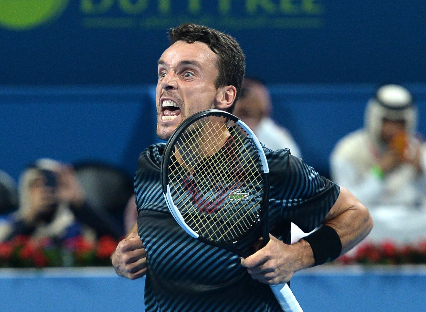 Roberto Bautista Agut of Spain celebrates winning against Djokovic.