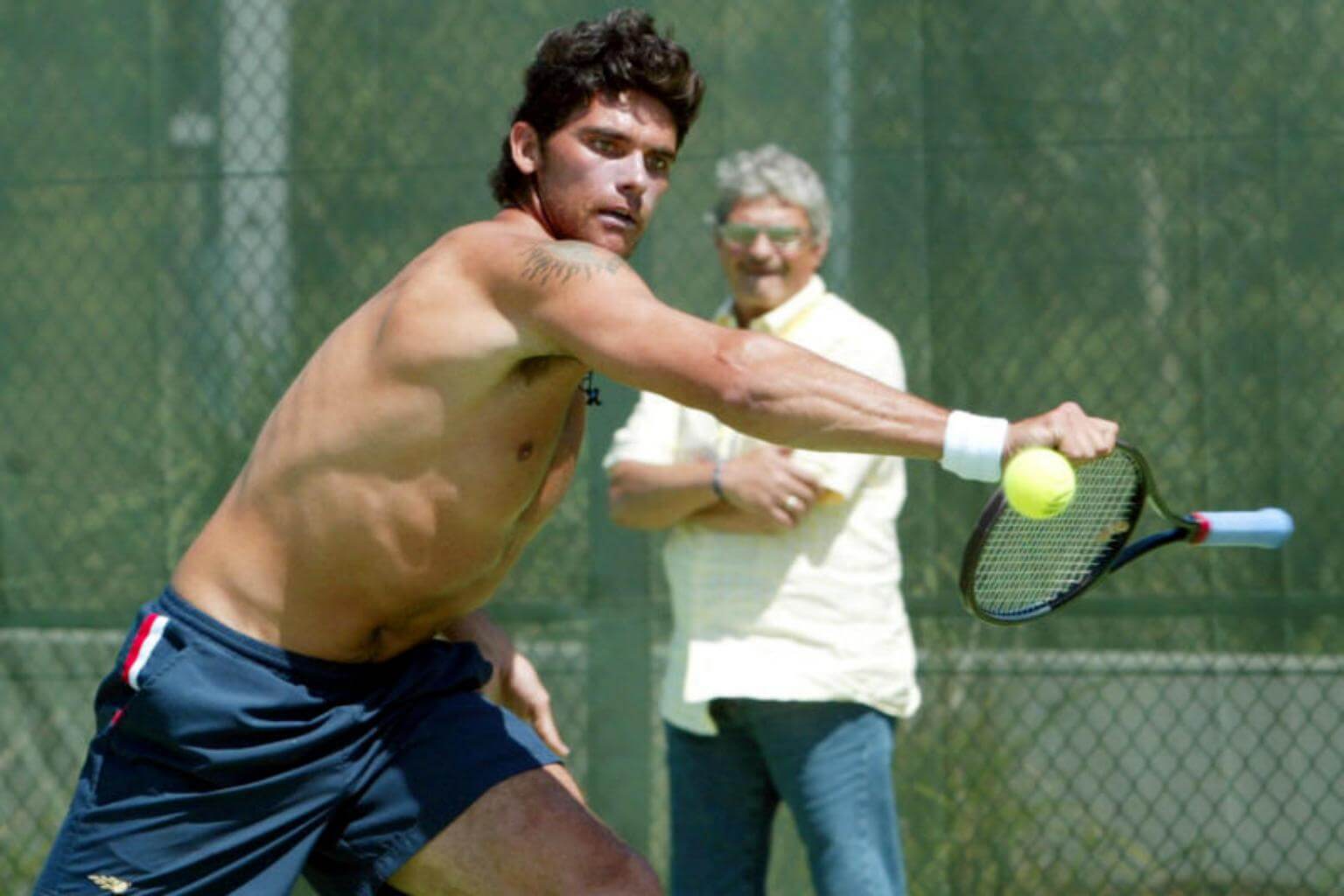 Mark Phillippoussis and his father Nick Phillippoussis during a practice session at the Sydney International Tennis Centre in 2004.