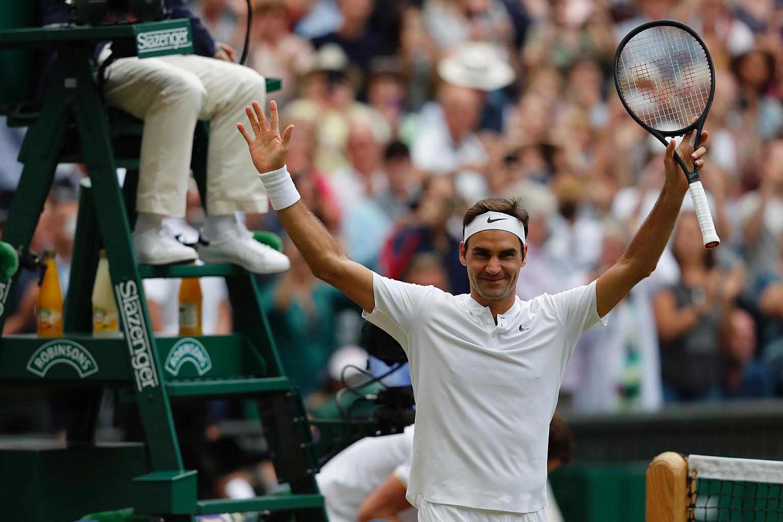 Roger Federer celebrates after winning against Tomas Berdych during their men's singles semi-final match, on July 14, 2017.