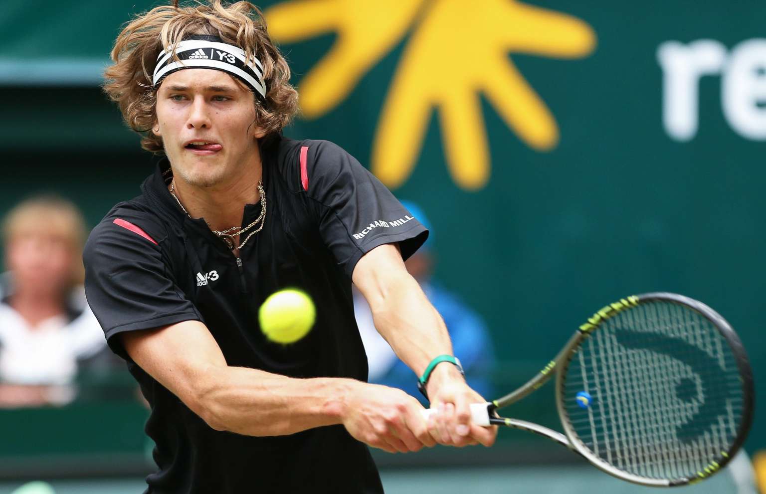 Alexander Zverev in action against Roger Federer during their semi-final match in Halle, Westfalen, Germany.
