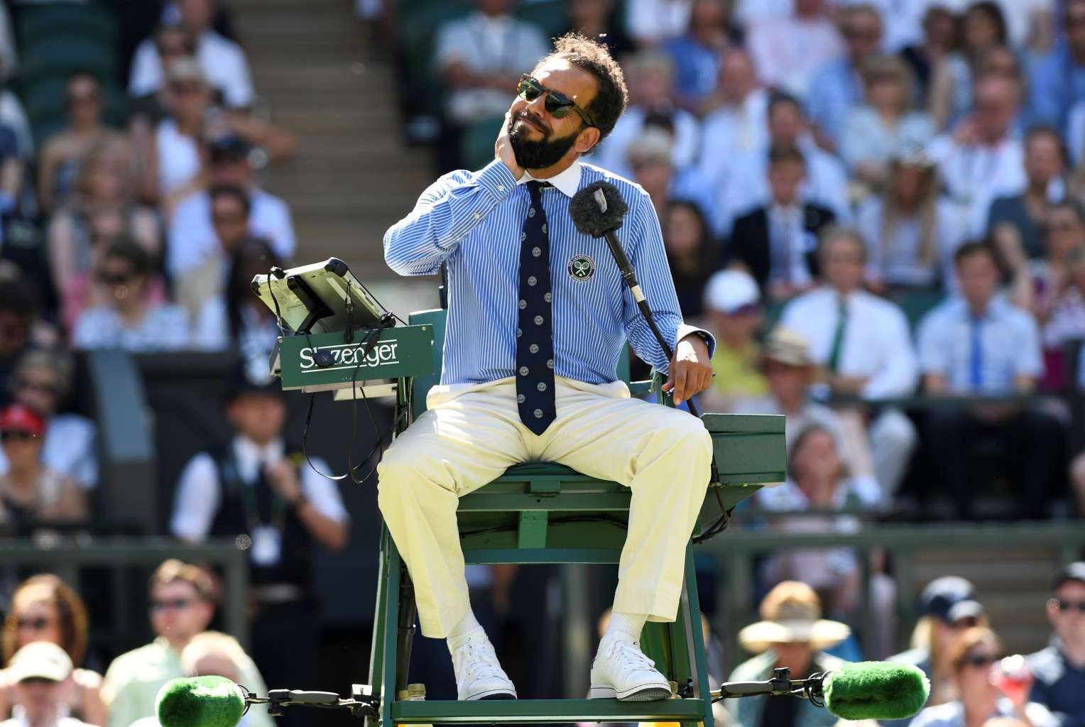 Umpire Kader Nouni on centre court reacts after he was surrounded by flying ants.
