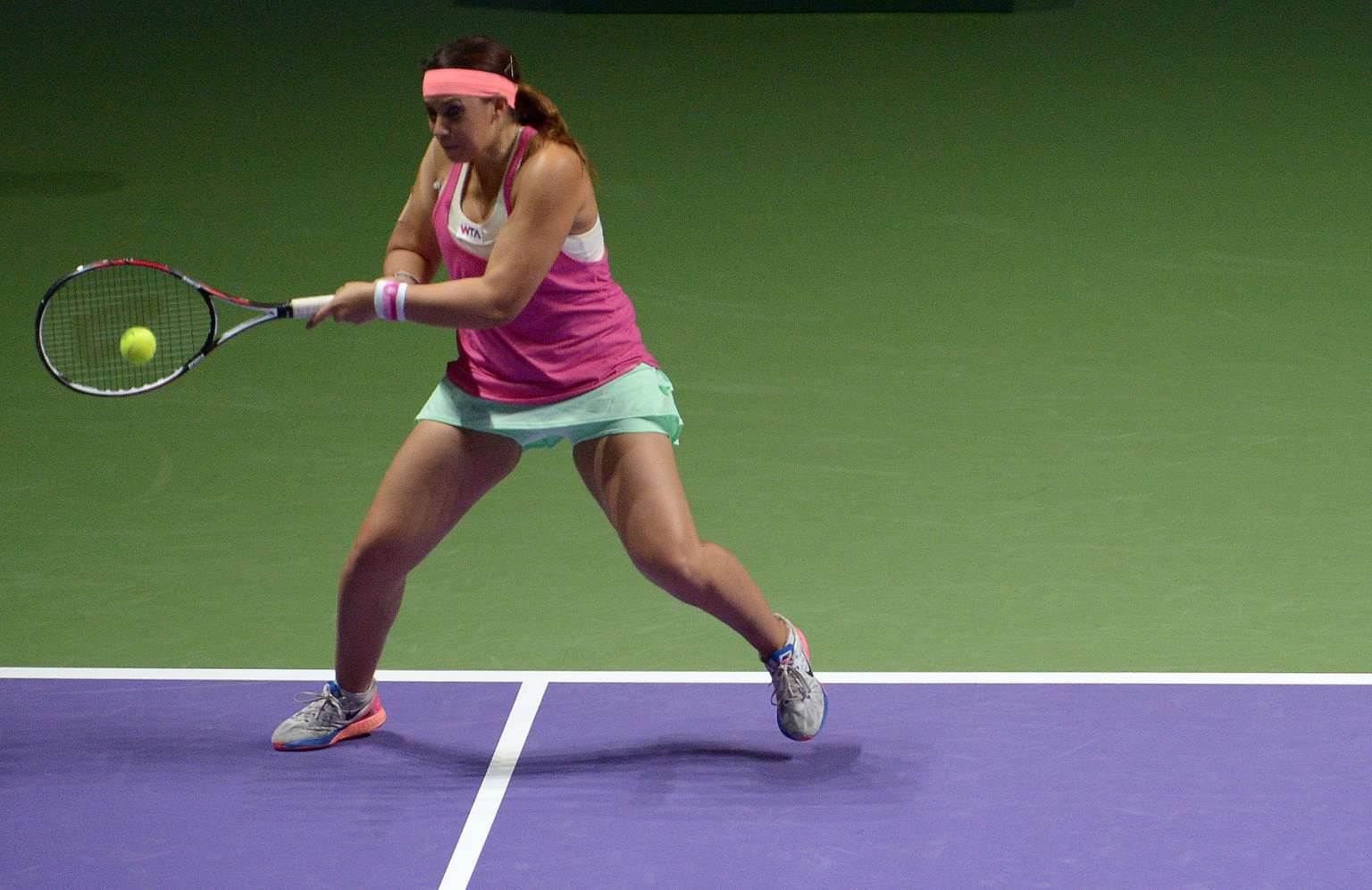 Former Wimbledon champion Marion Bartoli in action during the Legends match at the Singapore Indoor Stadium on Oct 20, 2014.