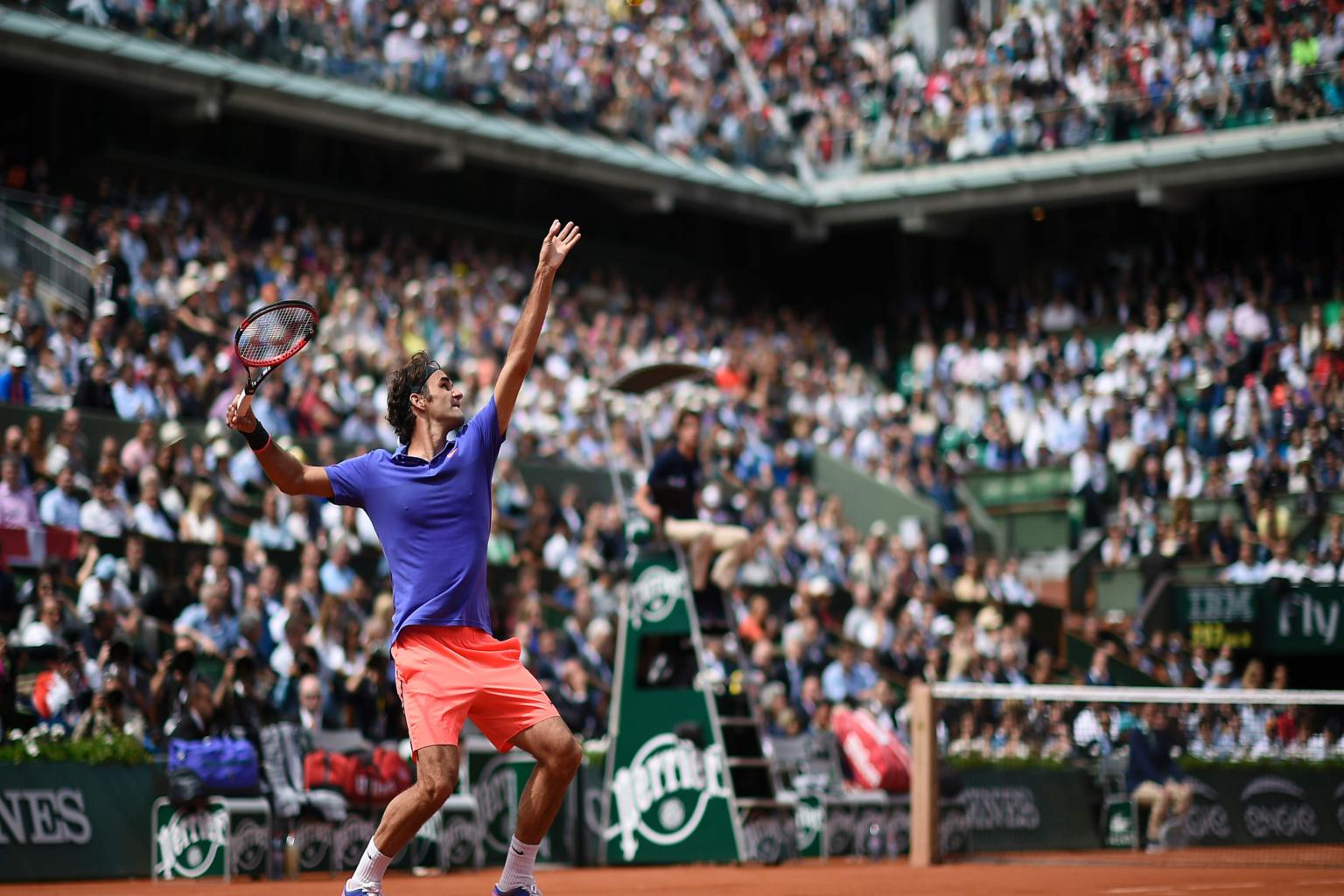 Roger Federer serving the ball to Damir Dzumhur during the men's third round at the Roland Garros 2015 French Tennis Open in Paris.