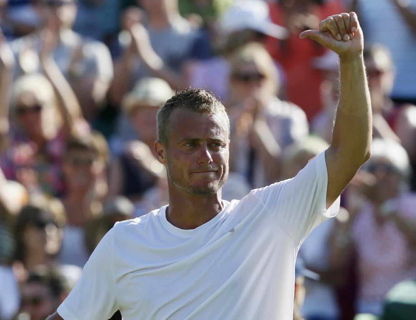 Lleyton Hewitt of Australia gestures to the crowd at the Wimbledon Tennis Championships in London, on June 29, 2015.
