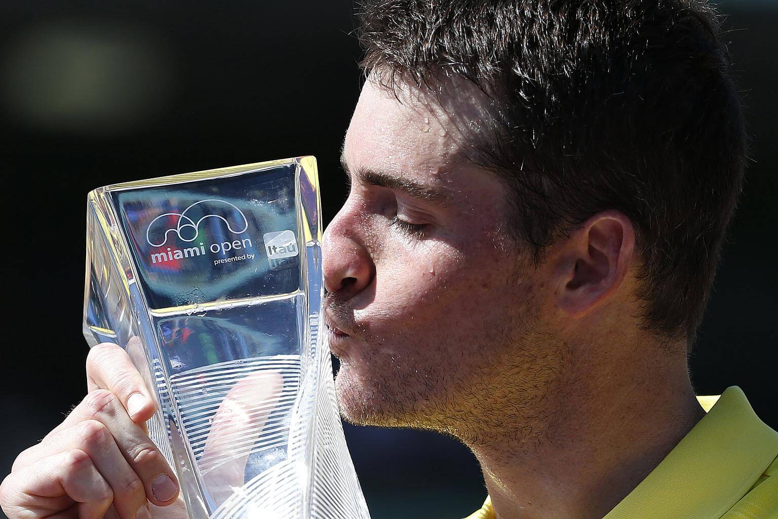 John Isner of the US kisses his trophy after defeating Alexander Zverev of Germany during their finals match at the Miami Open tennis tournament on Key Biscayne, Miami, Florida, US, on April 1, 2018.
