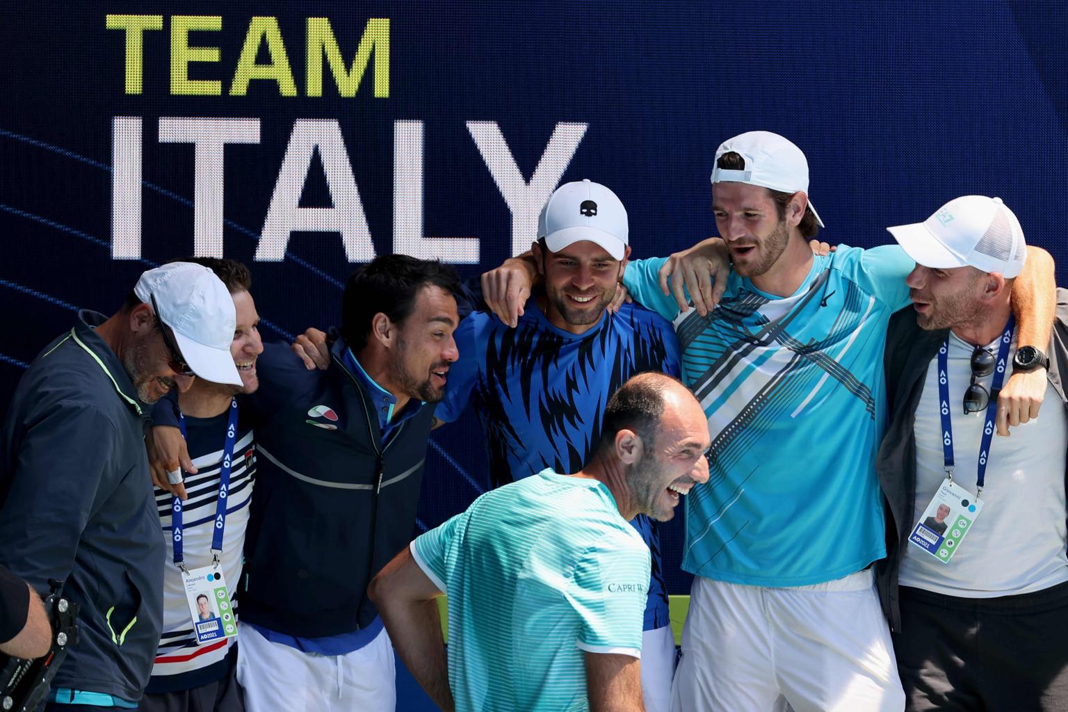 Team Italy celebrate their victory in the group C against France on day two of the 2021 ATP Cup in Melbourne on Feb 3, 2021.