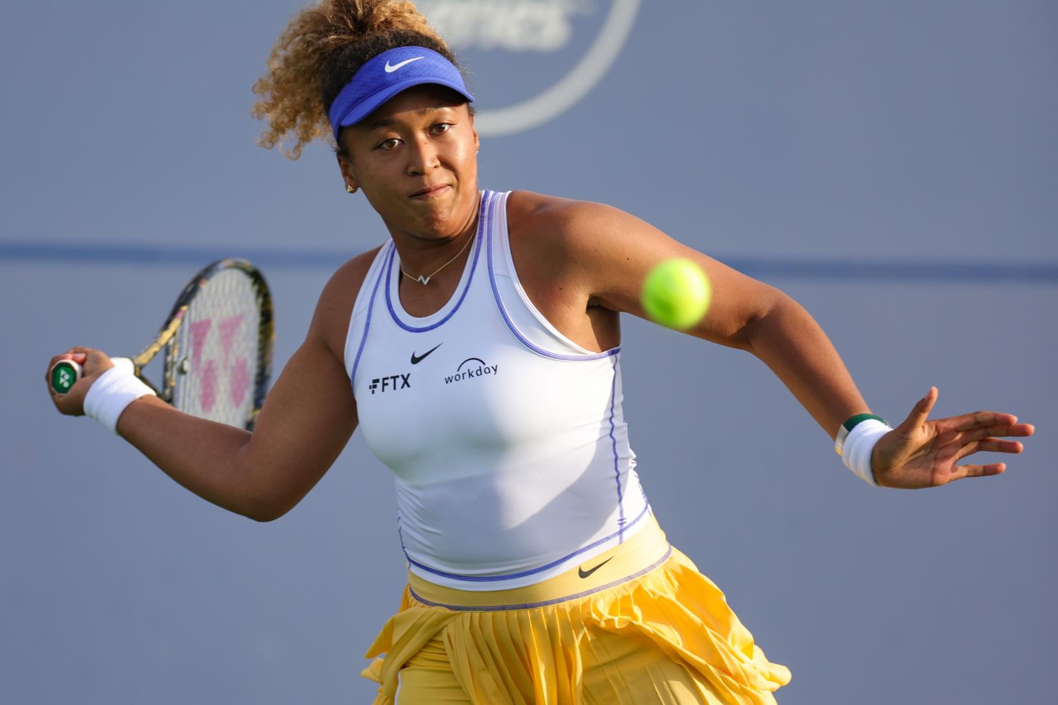 Naomi Osaka returns a shot from Zheng Qinwen, on Aug 2, 2022.