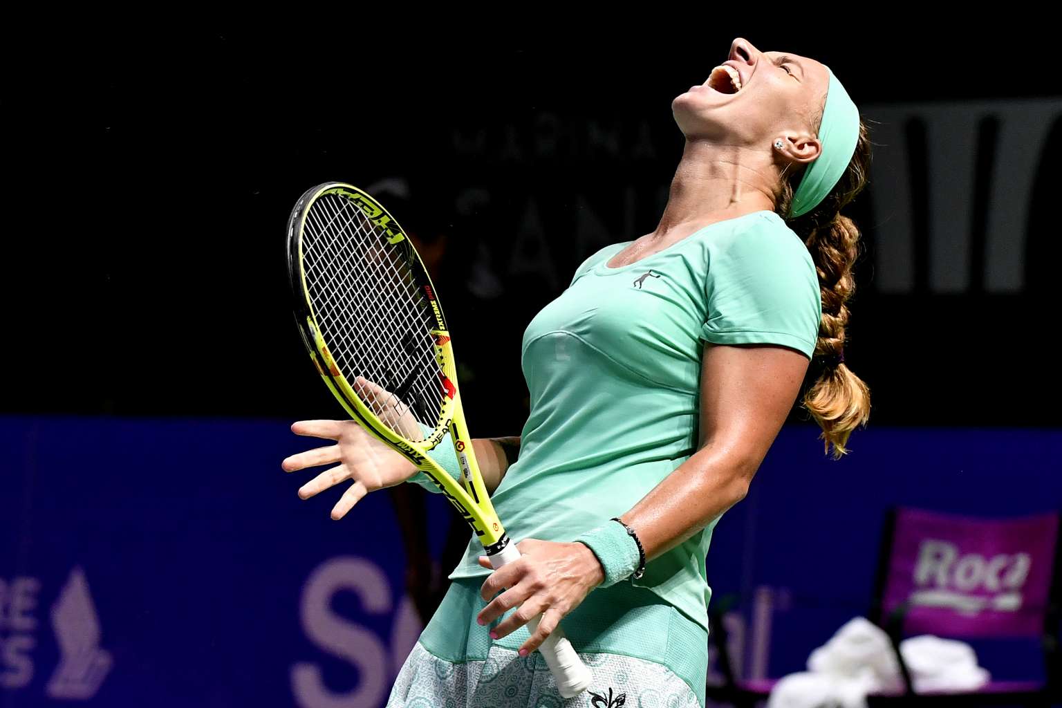 Svetlana Kuznetsova celebrating during her WTA Finals match against Agnieszka Radwanska at the Singapore Indoor Stadium on Oct 24, 2016.