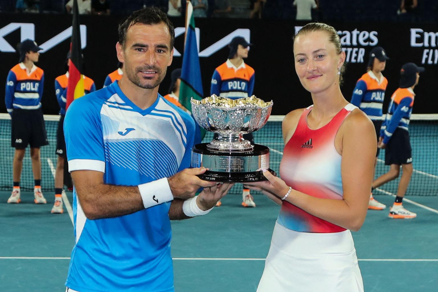 Ivan Dodig (left) and Kristina Mladenovic with the trophy after the mixed doubles final in Melbourne on Jan 28, 2022.