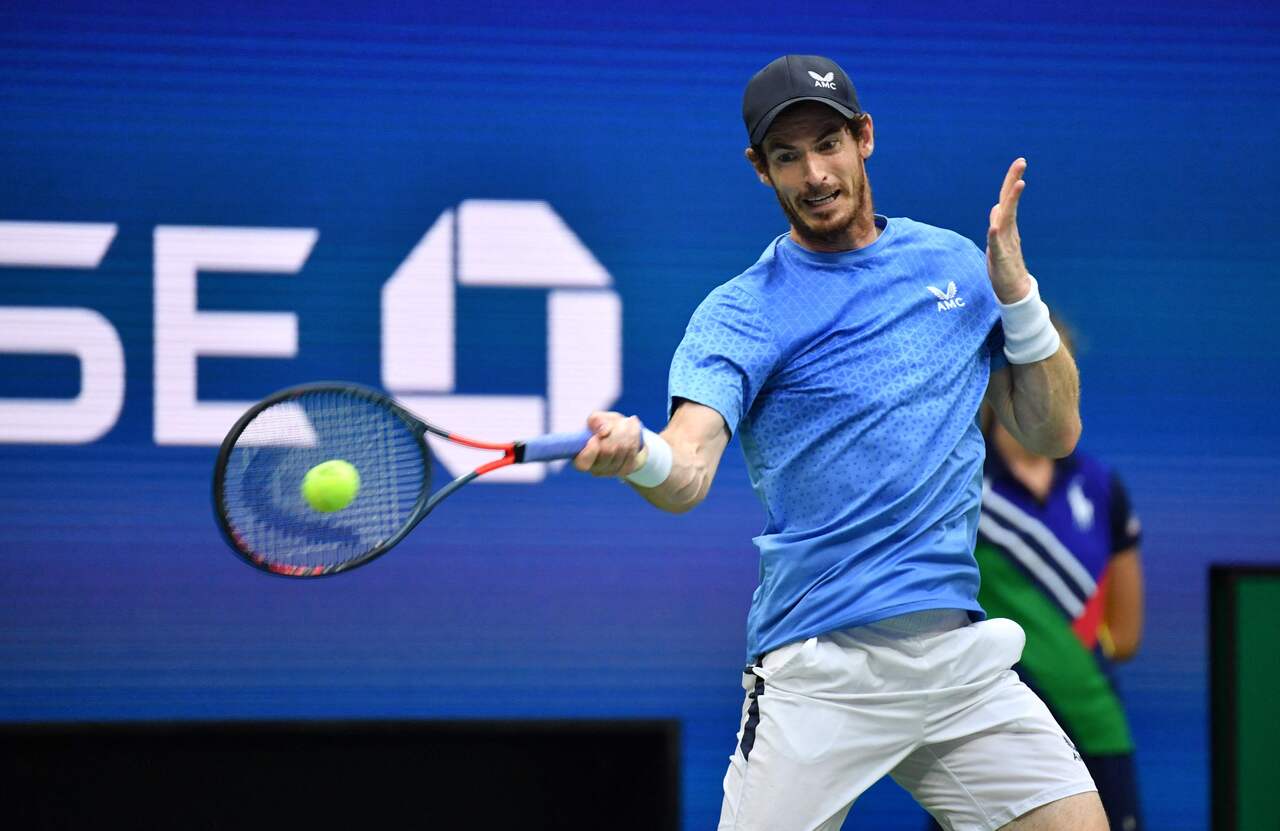 Andy Murray hits a return to Stefanos Tsitsipas at the USTA Billie Jean King National Tennis Center in New York, on Aug 30, 2021.